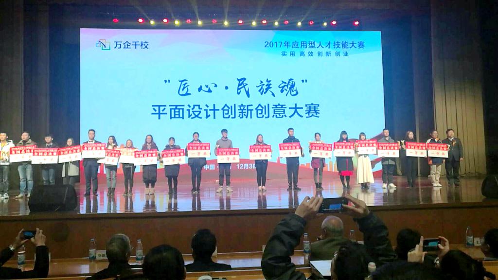 2017年12月,在2017年应用人才技能大赛——“匠心•民族魂”平面设计创新创意大赛上,我院计算机与信息技术系数字媒体应用技术专业的同学获得一个一等奖、两个二等奖。