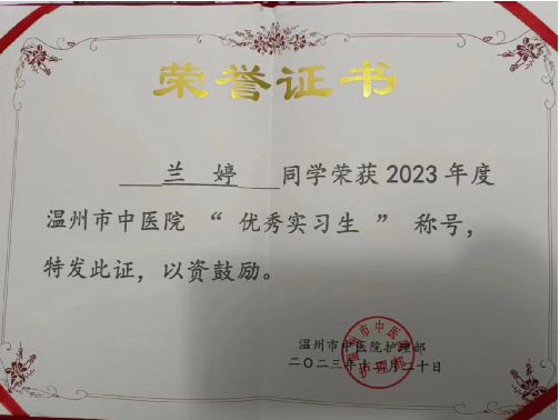 近日,在温州市中医院进行临床实习的我校护理与健康学院林子、兰婷2名同学荣获了温州市中医院“优秀实习生”称号。