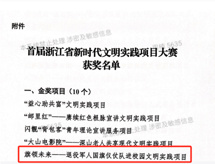 该项目由西湖区退役军人服务中心发起,组成退役军人国旗仪仗队,走进幼儿园、小学,通过“标兵式”炼队伍、“沉浸式”升国旗、“情景式”展军魂、“嵌入式”育小兵等方式,拓展国防教育形式,通过沉浸式国防教育形式,在学生中厚植爱国情怀、播撒崇军种子。队伍现有35名队员(其中我校退役学生23名),已走进学校15所,参与师生14000余人,培育学生仪仗队13支,服务时长达6280小时,相关经验做法被《中国退役军人》等40余家媒体点赞报道。