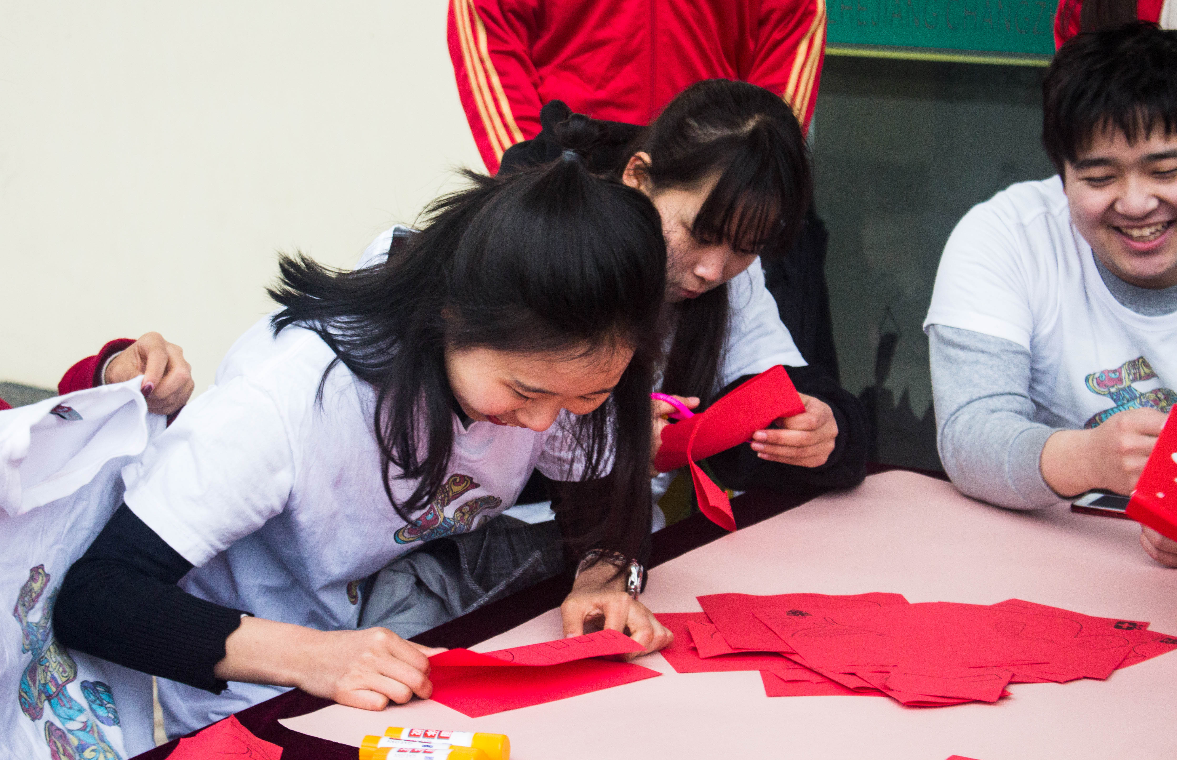 开幕式在汉服协会的古装展示和天籁音乐社的歌曲串烧中拉开帷幕。我校8个系80名学生代表参加“流光溢彩”现场剪纸、拼图制作比赛,各系参赛选手在指定的比赛区域里分工合作,配合默契,细致耐心地完成剪纸,并将剪纸拼成一幅幅代表着美好祝福的精美图案,赢得了围观师生的一致好评。