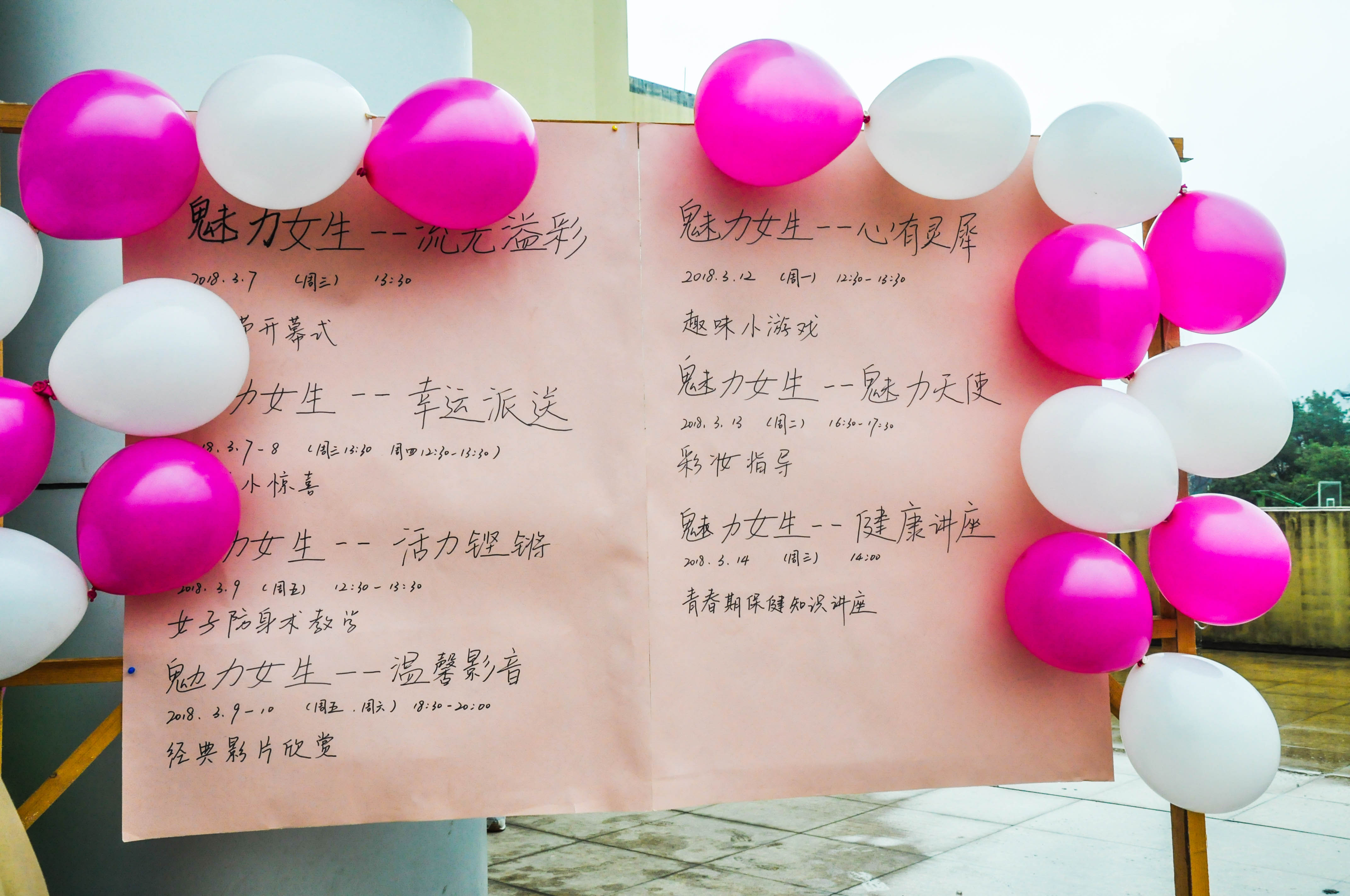 本届女生节从3月7日开始至3月14日结束,活动精彩纷呈,包含女子防身术教学、青春期保健知识讲座、女生彩妆指导、心有灵犀趣味小游戏、温馨影音经典影片欣赏、校园幸福派送等系列活动。