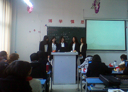 八支参赛队伍历时一个半小时,手持参展商品,身着职业装出场,对各自的参展商品用英语流利的向评委老师和在座的同学热情的推介,整个比赛洋溢着我院大学生青春的活力和蓬勃向上的朝气。